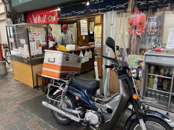 商店街でタコ焼きと回転焼きの誘惑に負けているところ