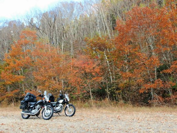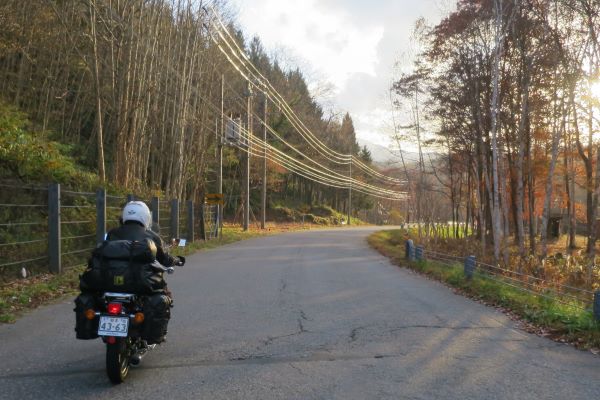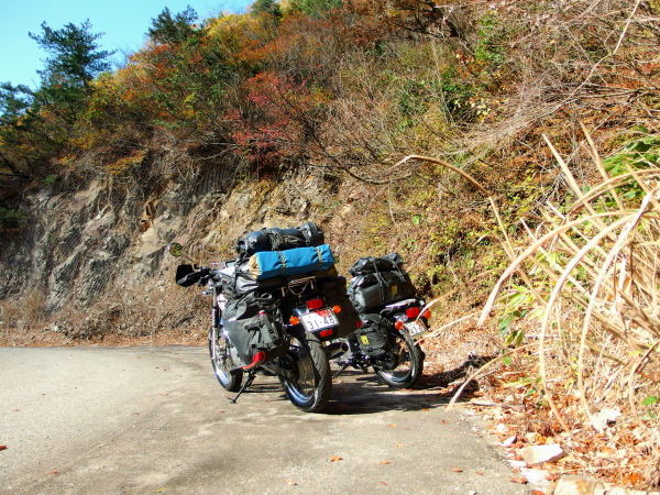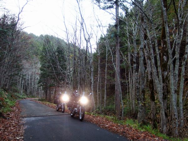 落ち葉で道の色が茶色や黄色になっているワインディングもハイペースで楽しみましたが、後ろの荷物を全く感じさせ