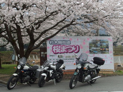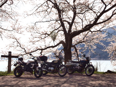 平日だというのに、見ごろを迎えた桜を目当てに大渋滞でノロノロ運転が続きますが、ボンネとスクランブラーは何事も無かったかのように、歩くような速度で花見を楽しみました。