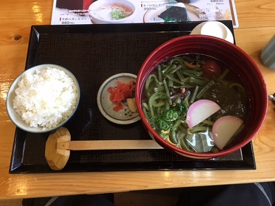 道の駅で、2人は緑色のうどん(名物笹うどん)をすすりながら、